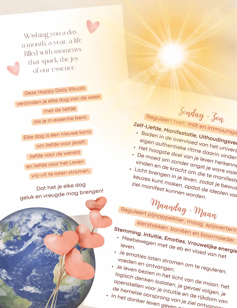 🪐 7 inspiratiekaarten met mini-planetengids over de invloed die de Zon heeft op zondag, de Maan op maandag, de planeet Mars op dinsdag, Mercurius op woensdag, Jupiter op donderdag, Venus op vrijdag en Saturnus op zaterdag,